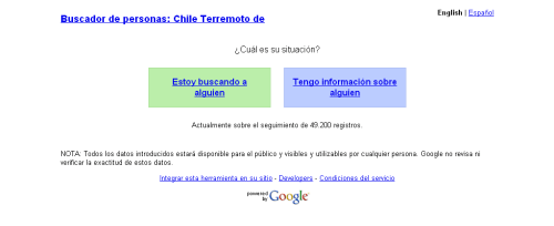 GUANARTEME.- Como muchos otros blogs y,  ante el caos oficial chileno,  les informamos a todos los interesados que  Google ha implementado un sitio para ayudar en la tarea de Búsqueda de Personas. Damos a conocer esta iniciativa porque  mientras más gente la conozca y la utilice, mayor será su efectividad: Buscador de Personas: Terremoto en Chile