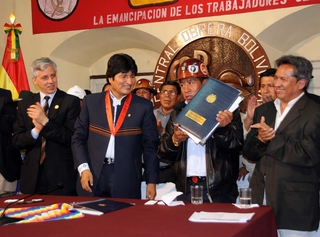 La Ley de Pensiones fue promulgada por el presidente Evo Morales en la sede de la Central Obrera Boliviana (COB), el máximo organismo de dirección laboral, en un hecho histórico e inédito en la historia del país.