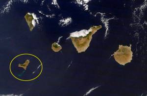 MD38. MADRID, 13/10/2011.- Fotografía de satélite facilitada por la NASA donde se aprecian las manchas de las emisiones volcánicas (i) producidas tras la erupción que comenzó el lunes pasado en el mar de Las Camas, frente a la isla de El Hierro. EFE/ ***SÓLO USO EDITORIAL***